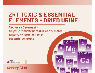 Measures the essential nutrients iodine, selenium, lithium, and bromine, plus the toxic heavy metals arsenic, cadmium, and mercury and the waste by-product creatinine. Dried urine only (no blood spot).